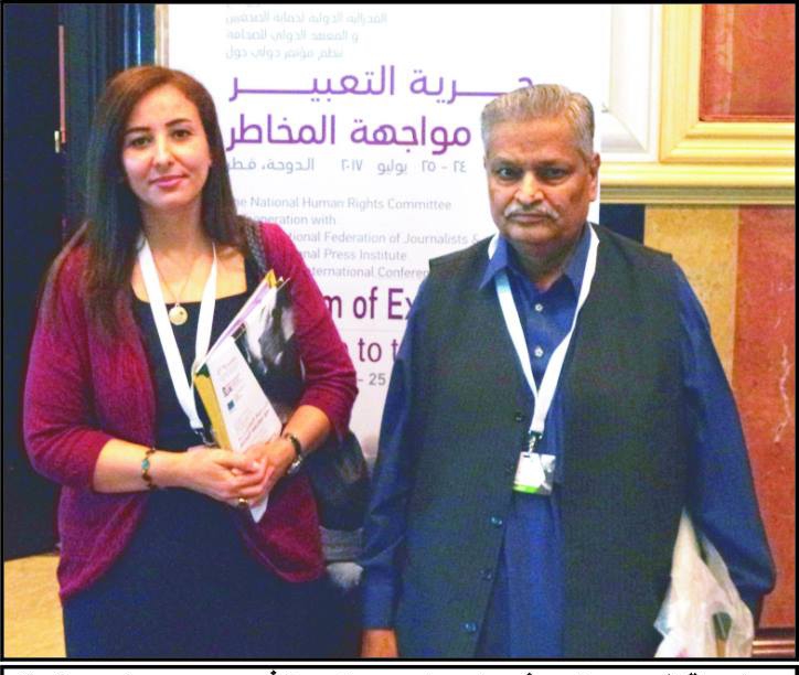 Neven Melek, Head of the International Department & Manager Advocacy, pictured with RMNP President Ehsan Ahmed Sehar during an international media conference in Doha.