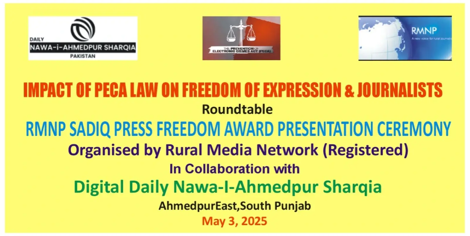 Rural Media Network in collaboration with Digital Daily Nawa-I-AhmedpurSharqia will organise a roundtable titled ”Impact OF PECA LAW ON FREEDOM OF EXPRESSION & JOURNALISTS ” in the premises of Punjab College AhmedpurEast on 3rd May 2025 at 3 PM. Different press clubs and journalists unions presidents, academics and press freedom advocates will attend it .RMNP will also present its annual press freedom report besides RMNP Sadiq Press Freedom Cash Award Category B and C, sponsored by Digital Daily Nawa-I-AhmedpurSharqia.RMNP roundtable will discuss the frequent registration of cases and arrests of the journalists under PECA law in the different areas of Pakistan.