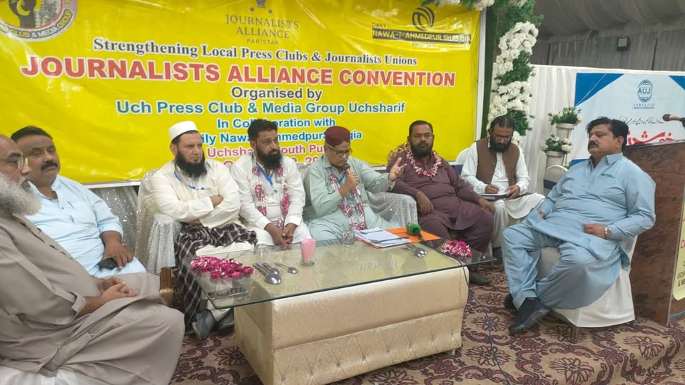 Uchsharif : Press clubs presidents of three districts were invited by the Rural Media Network Pakistan (RMNP) on the request of the organisers Daily Nawa-i-AhmedpurSharqia and Uch Press Club & Media Group Uchsharif to attend the Journalists Alliance Convention held in Al-Abbas Marriage Hall UchSharif on 22nd October. RMNP President Ehsan Ahmed Sehar himself moderated the convention, which was attended by more than two hundred journalists representing twelve press clubs from Bahawalpur, RahimYar Khan, and Muzaffargarh districts, along with the Ahmedpur Union of Journalists. A total of twenty-six speakers addressed the convention, making it a significant event aimed at promoting unity, solidarity, and professional cooperation among journalists in Southern Punjab.